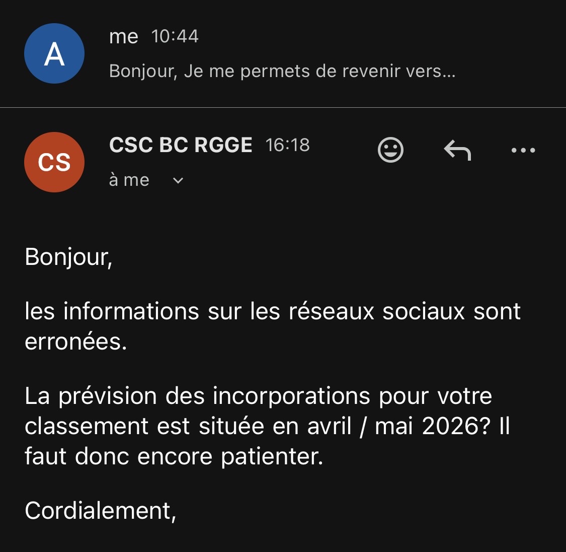 Non la LC n’a tjrs pas été convoqué encore, il reste une trentaine de personne de la liste principale (2100) puis après c’est au tour de la LC d’incorporer (351), ça devrait bientôt arriver mais pas encore la fin pour le moment ![]()